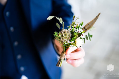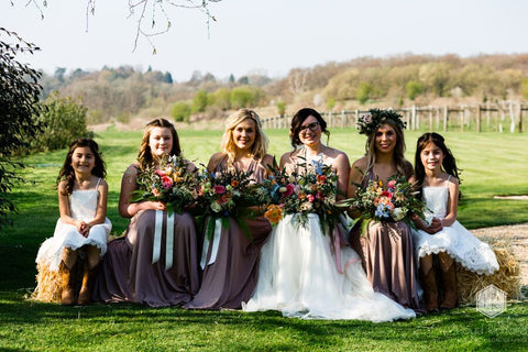 We provided an abundance of flowers for the Wedding; the bridal bouquet, bridesmaids, hair circlets and circular wreaths for the barrel tops. The flower list included Icelandic poppies, cream Yves Piaget roses, waxflower, apricot lisianthus, pale blue muscari, scabious seedheads, delphinium balkied, pheasant feathers, astilbe Washington, umbrella fern, pussywillow and baby blue eucalyptus.