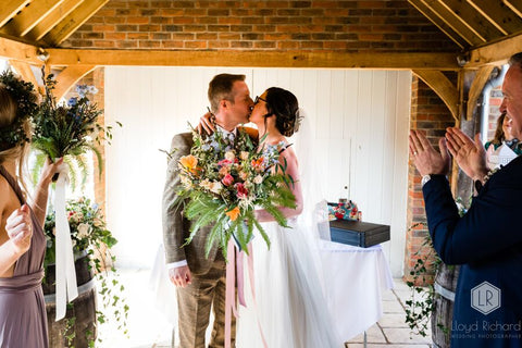 Set at the stunning Wickham Vineyard, Tara wanted to create something a little different, she loves coral so Icelandic poppies were a must for this wedding! With romance and a touch of the countryside inspiring the flower choices we created a rustic, wild looking wedding complete with JD bottles of blooms for the tables which Tara had collected.