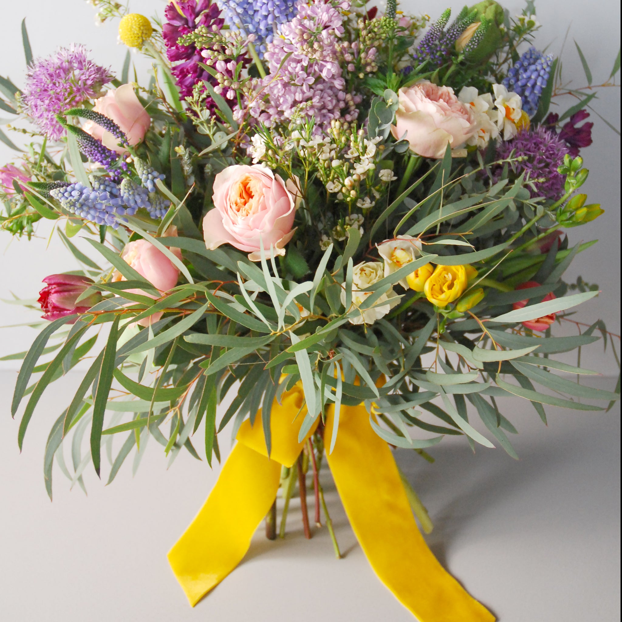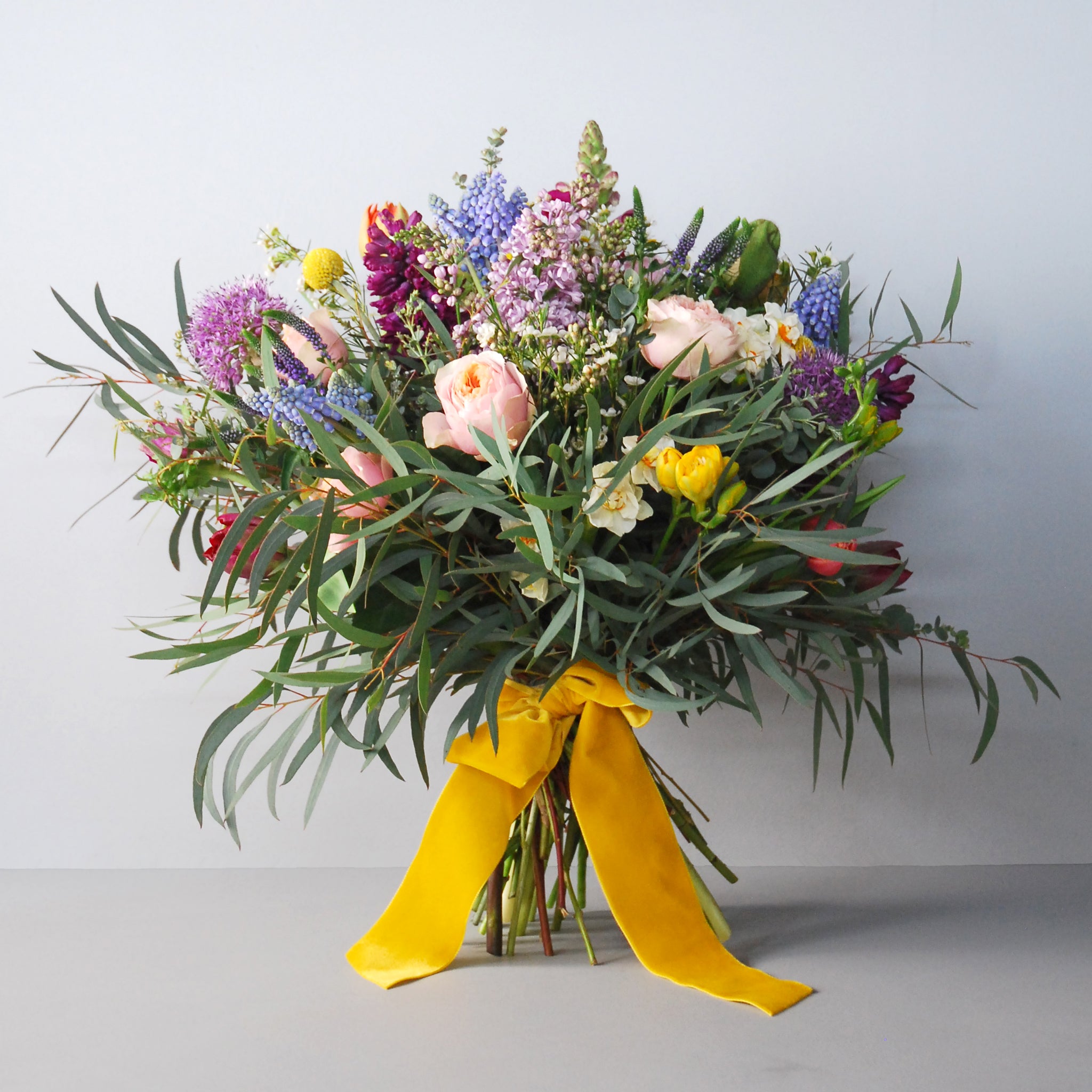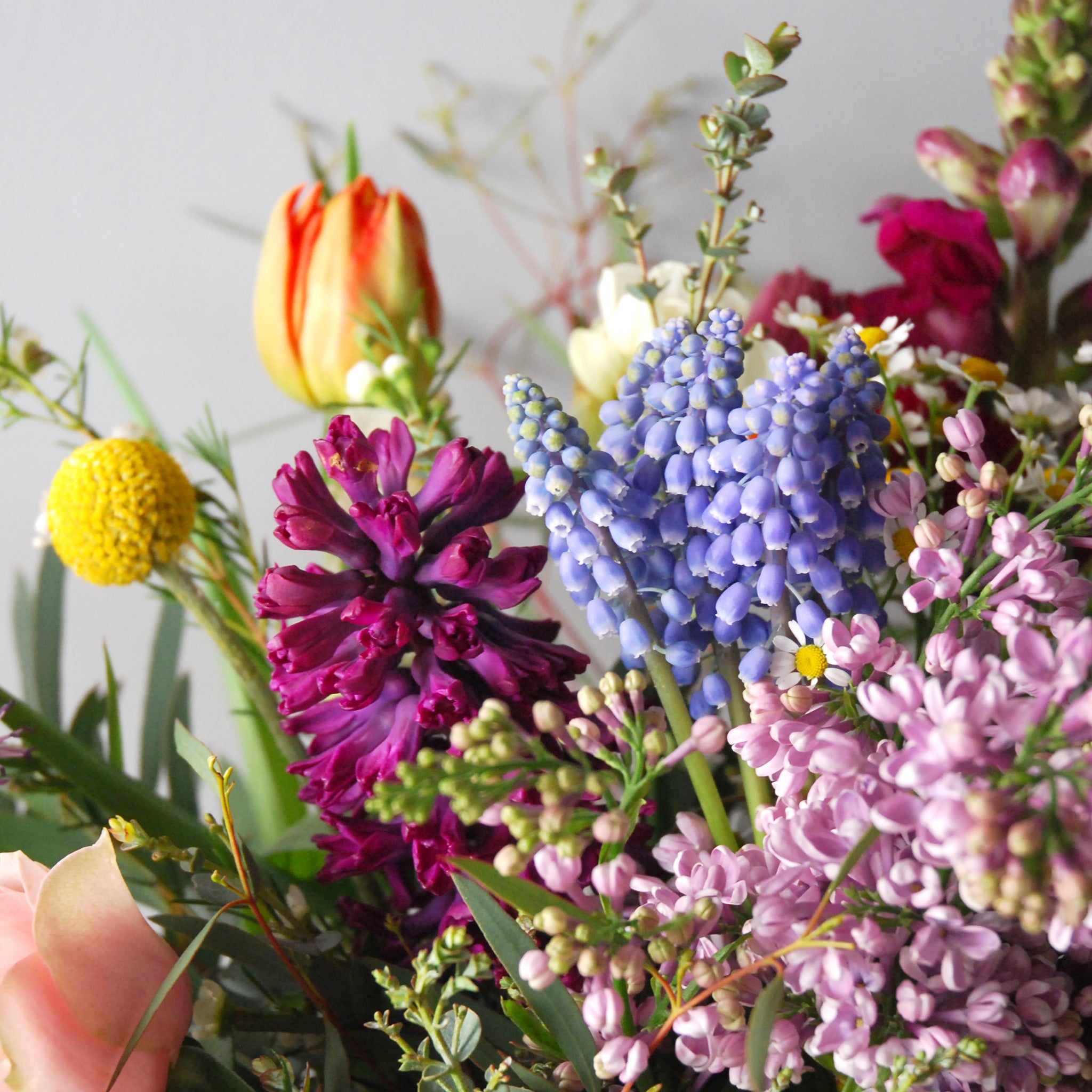 A stunning seasonal bouquet loaded with colour and scent to celebrate the arrival of spring. It features some of favourite springtime blooms - depending on availability the recipient may find tulips, muscari, hyacinths, narcissi, roses and ranunculus.