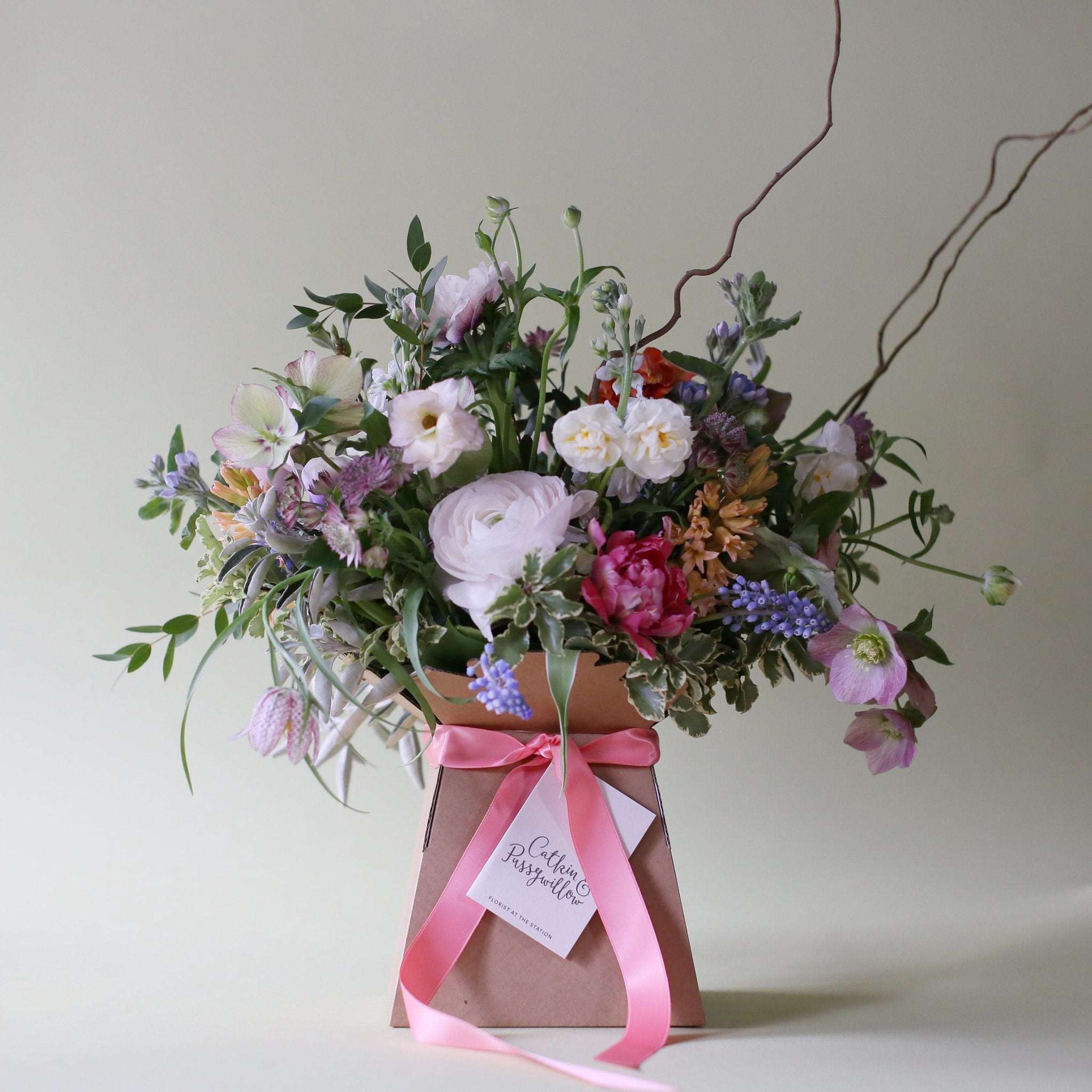 All of our bouquets are hand made to order meaning each one is truly unique. The pictures show an example of the bouquet, and you can expect to receive one featuring seasonal flowers similar in colour, style and texture.