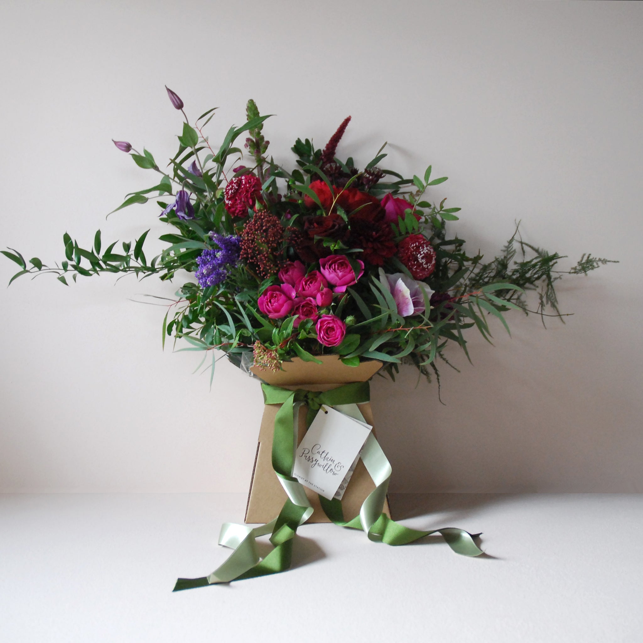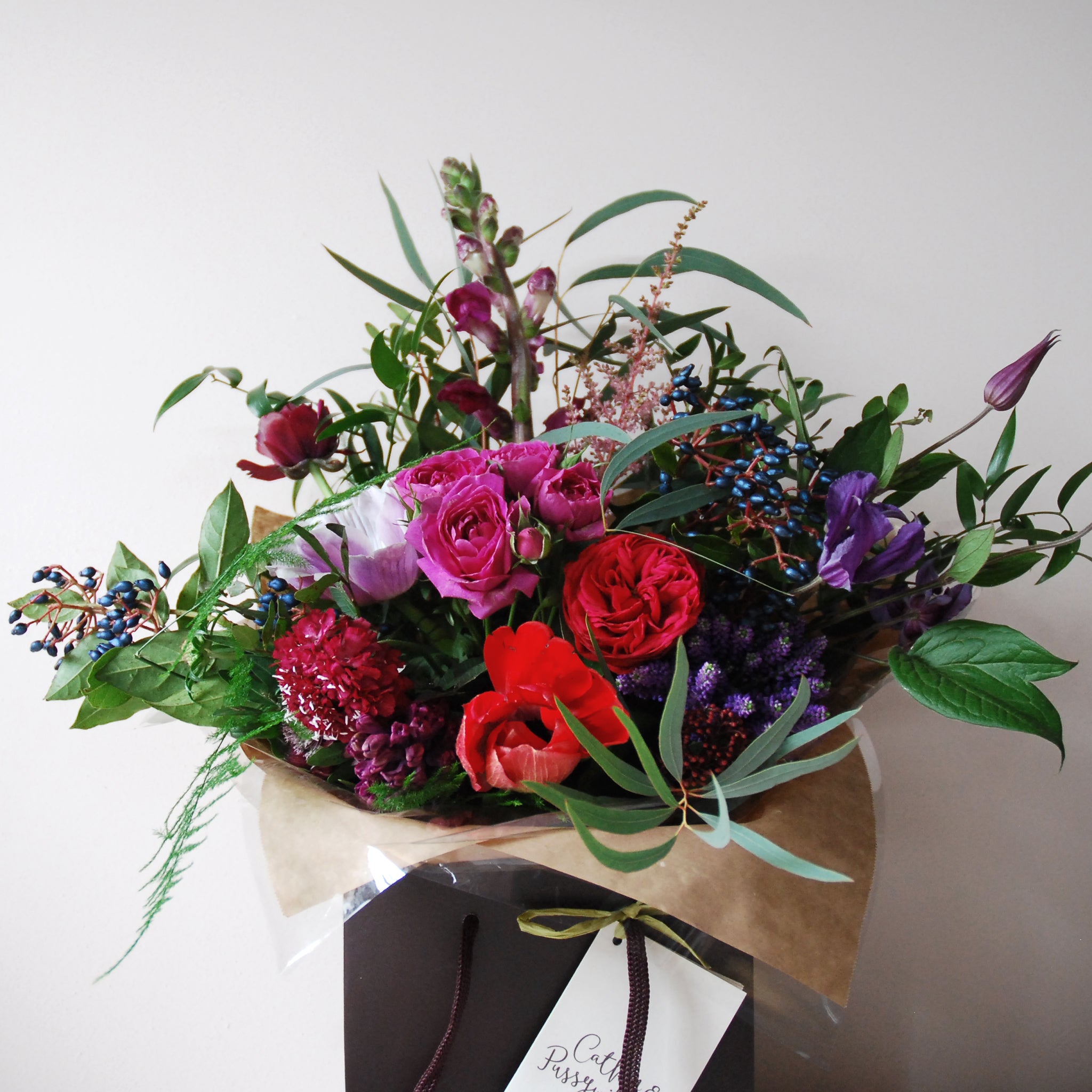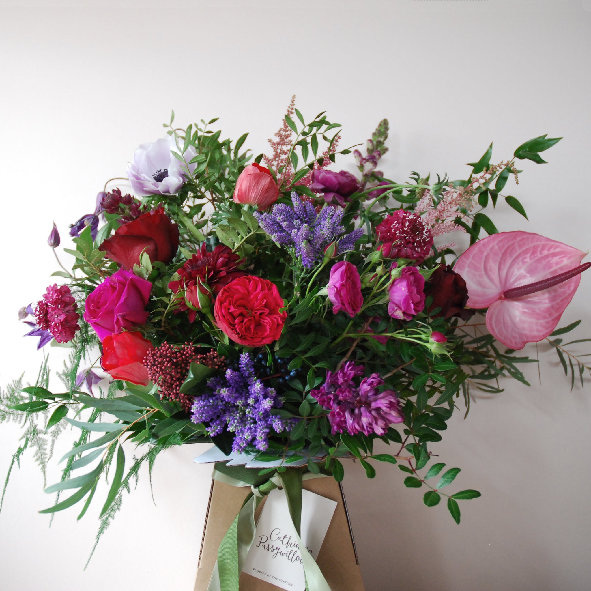 No run-of-the-mill Valentine’s day bouquet, this is our take on the traditional. Old Romantic offers a plethora of scent, shape and textures, featuring a variety of stunning jewel-coloured roses and flowers in scarlet, burgundy, magenta, deep purple and cerise complemented by blue, bottle green and jade berries and foliage.