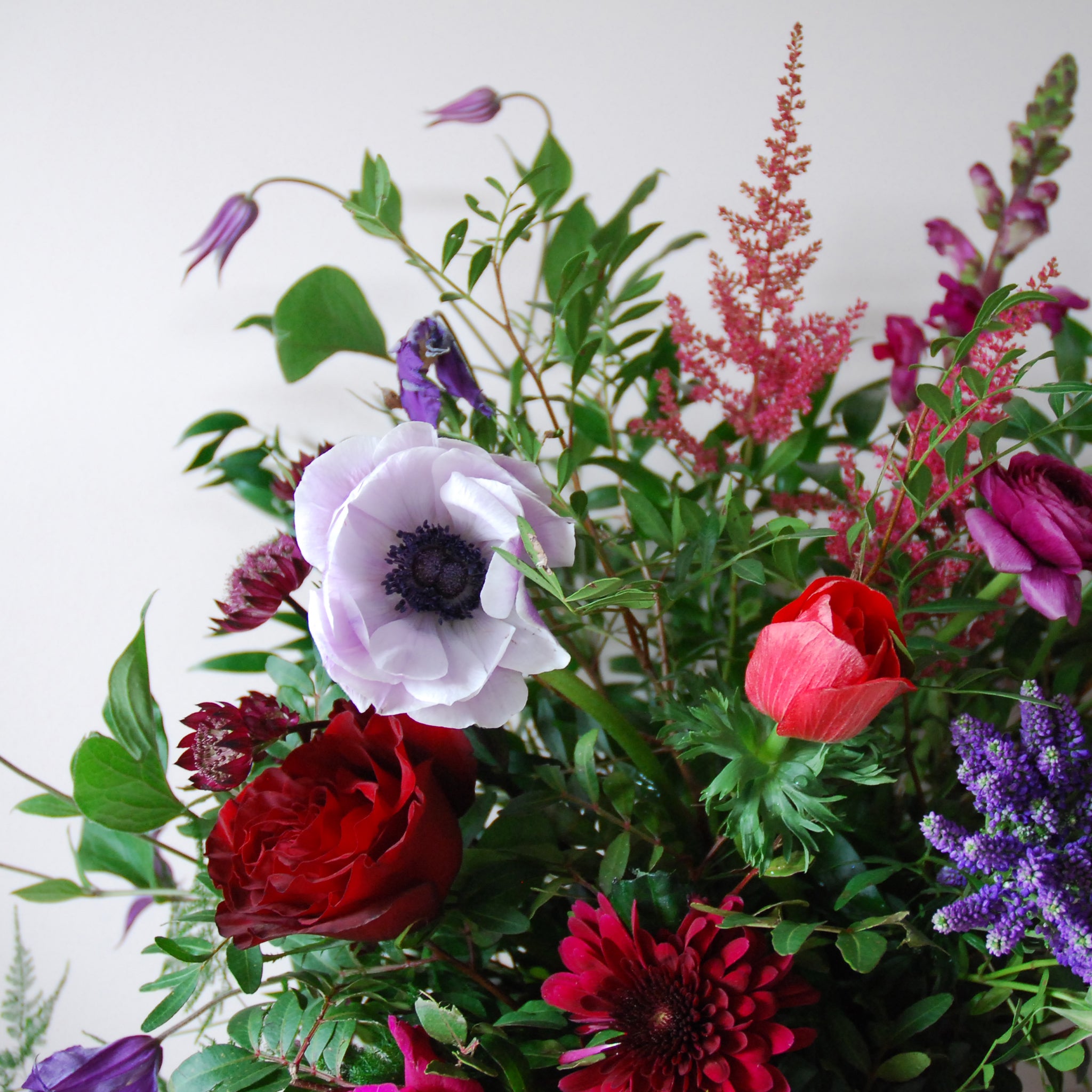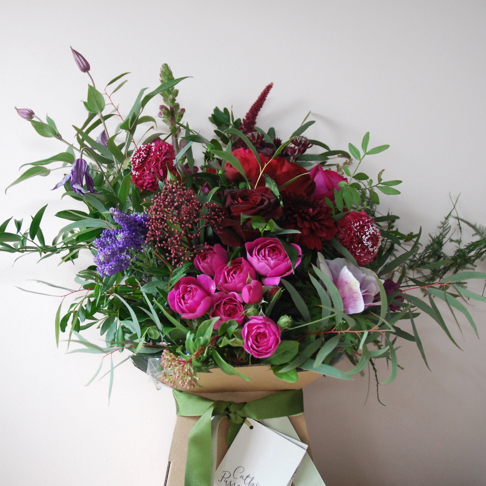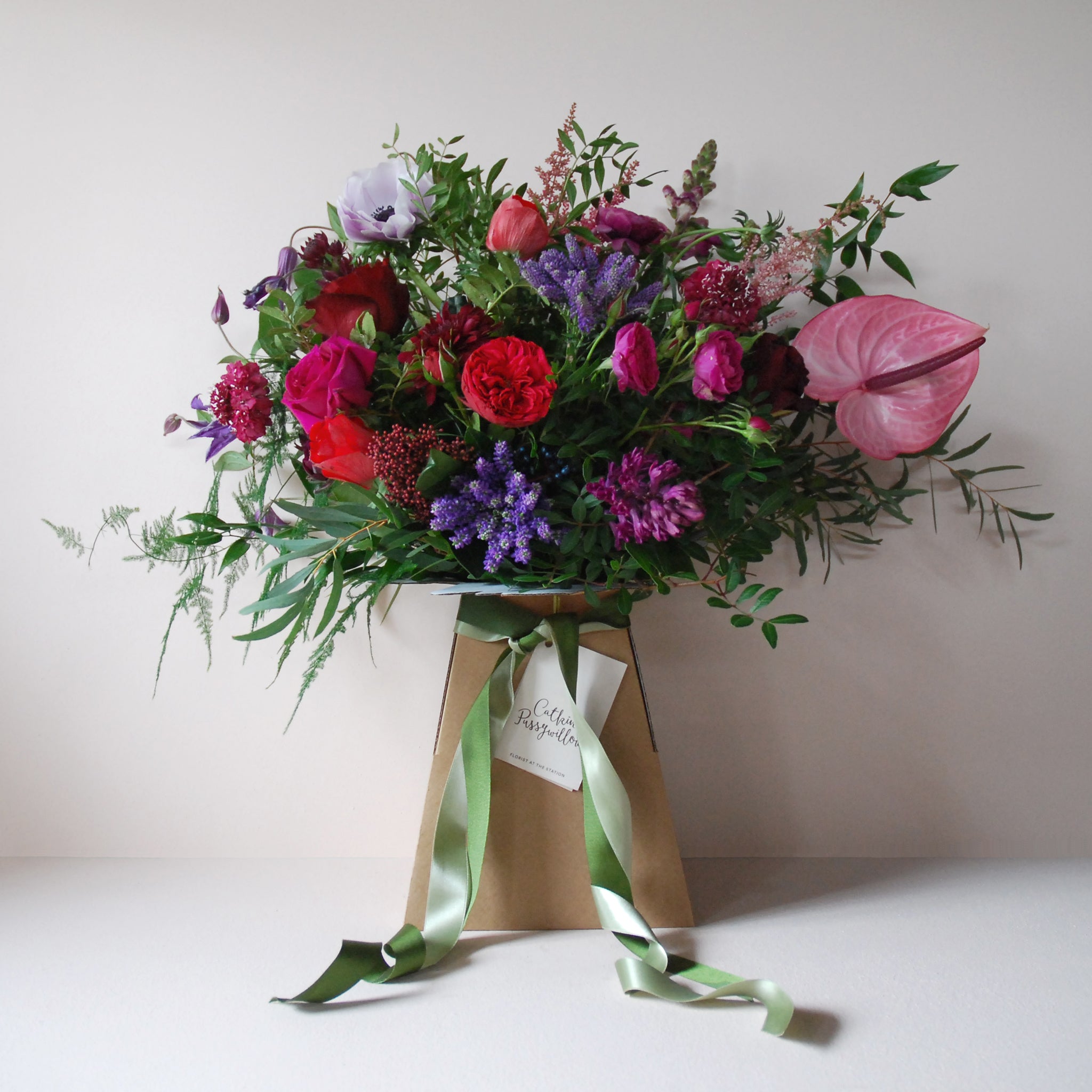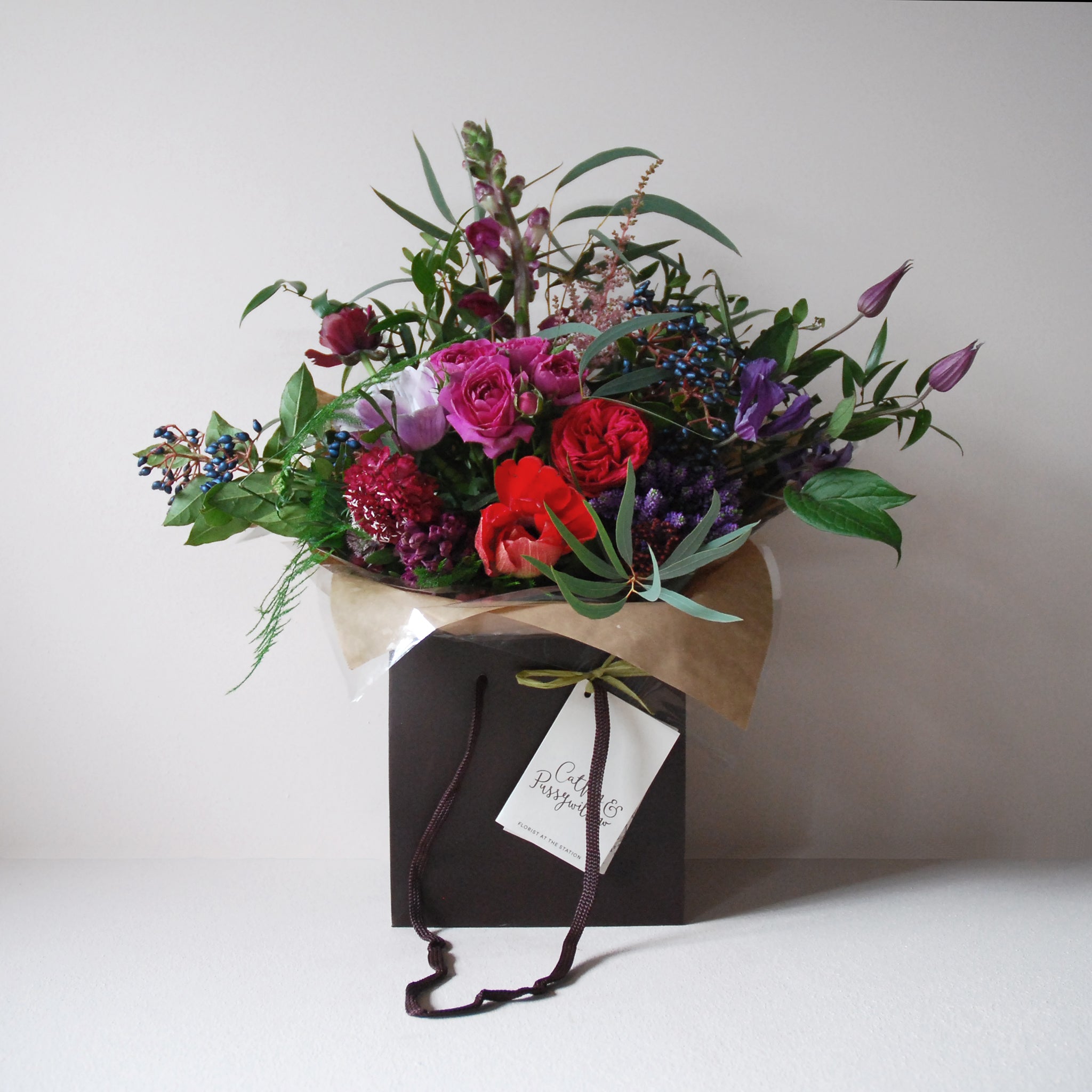 No run-of-the-mill Valentine’s day bouquet, this is our take on the traditional. Old Romantic offers a plethora of scent, shape and textures, featuring a variety of stunning jewel-coloured roses and flowers in scarlet, burgundy, magenta, deep purple and cerise complemented by blue, bottle green and jade berries and foliage.