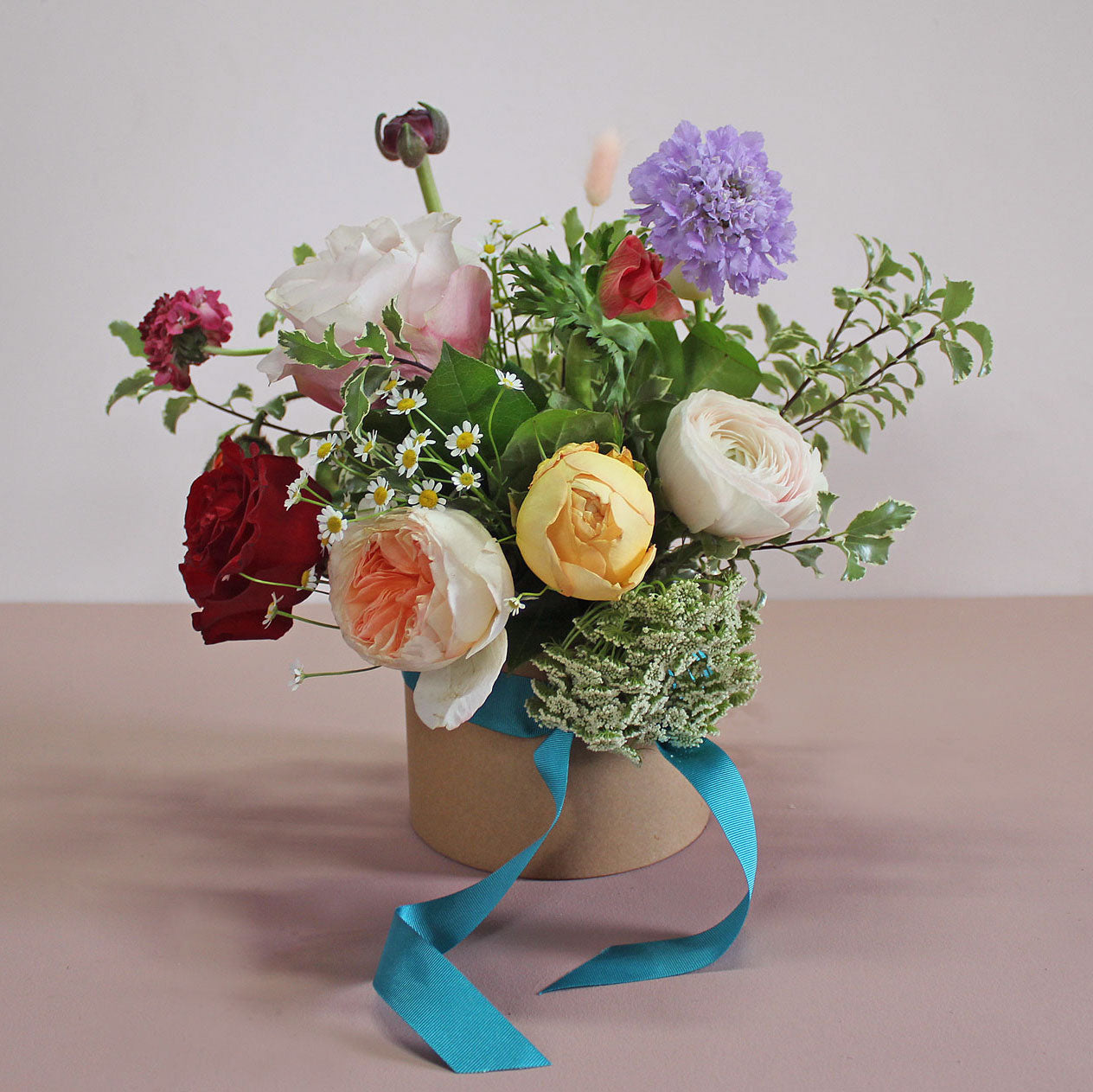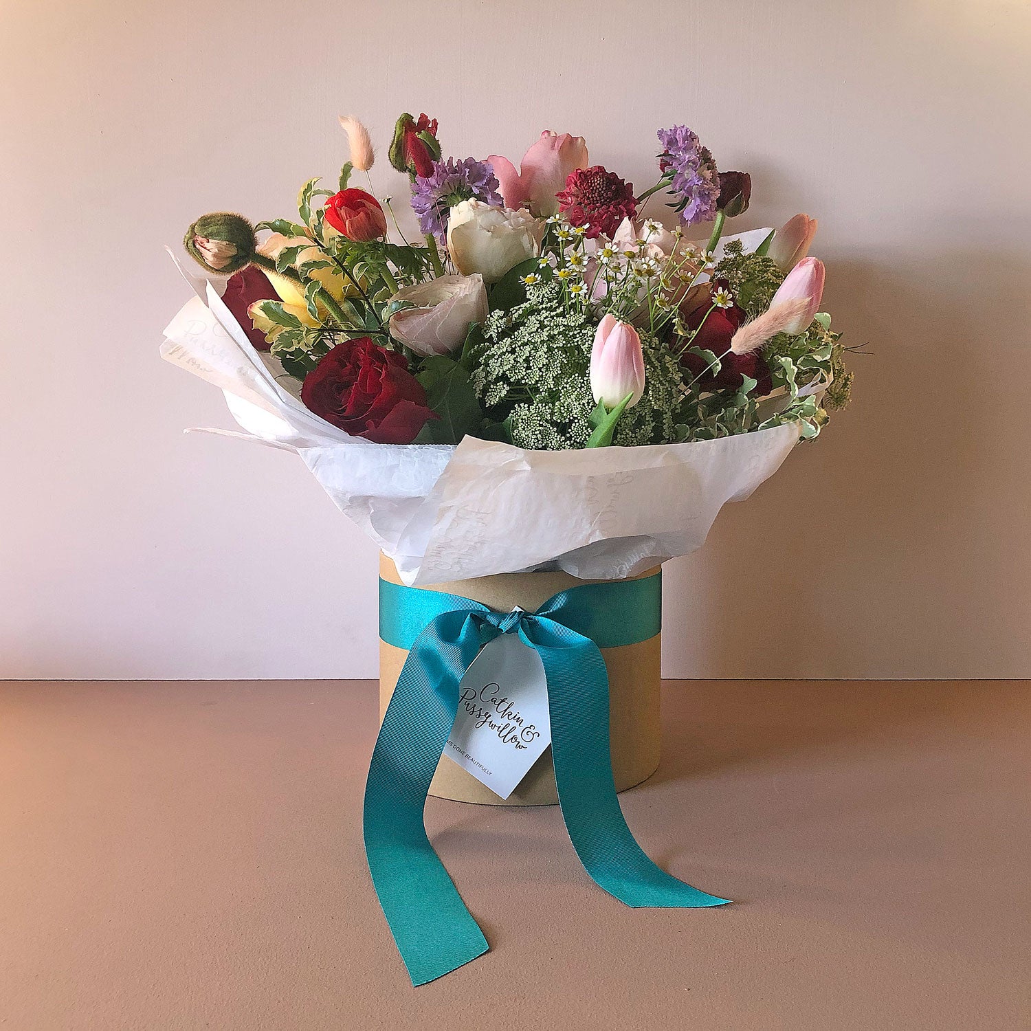 The bouquet is available in three sizes, medium, large, and Make Their Day. The bouquets are presented in a beautiful kraft box or if you choose 'Make Their Day' this is presented in a beautiful glass apothecary vase.