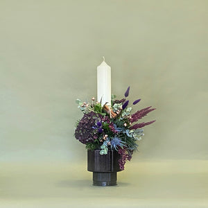 Dress your festive table in style, adorn your window or mantel or gift to friends and family this party season. Our Christmas candle arrangements are all handmade to order and feature beautiful seasonal foliage, winter berries and flowers. Candle / Candles included, and the gorgeous coloured ribbed vases that perfectly complement the tones of the arrangement.